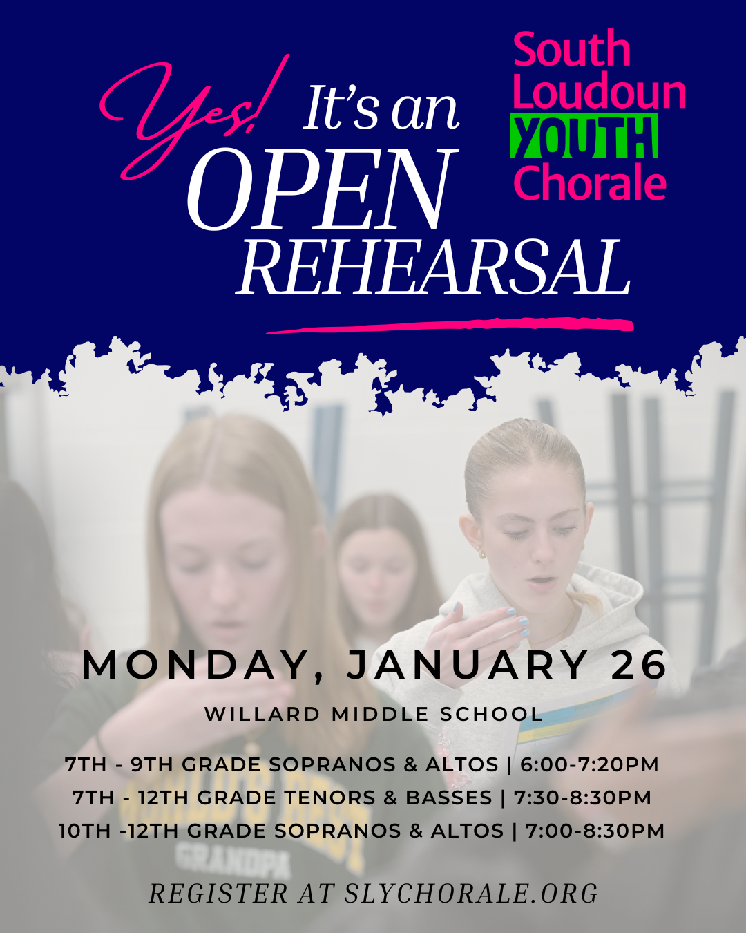 Step inside a South Loudoun Youth Chorale rehearsal. On Monday, February 2nd (postponed date), join us at Willard Middle School for an exclusive Open Rehearsal experience. Sit among our singers, feel the energy in the room, and discover what makes SLYC a place where talented young musicians grow, connect, and shine. This is your chance to see what it’s like—before anyone else.
